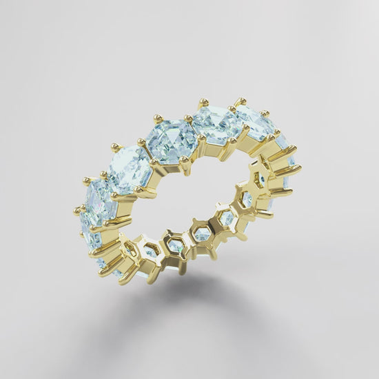 Eternity ring crafted with 18K gold and hexagon-cut light blue topaz stones.