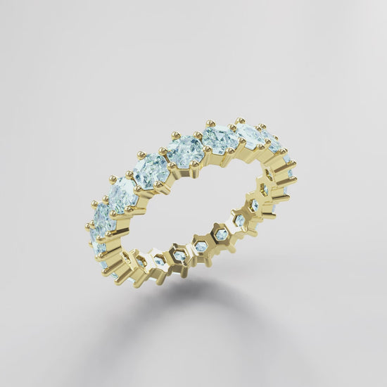 Exquisite eternity ring meticulously crafted with 18K gold and adorned with hexagon-cut light blue topaz stones. This enchanting ring combines timeless elegance with a touch of geometric charm, making it a captivating symbol of everlasting beauty.